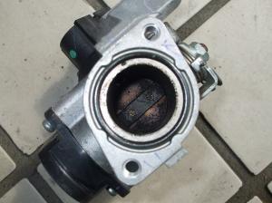 電子制御燃料噴射装置です。50CCや125CCには少し無理がある装置に感じていますが。特にV125はカーボンが溜まり易く症状も出やすい車両です。今回の車両は7000キロぐらいでしたがカーボンが溜まっていました。症状としてはエンジンのかかりが悪くなった。かかっても安定していない。吹け上がりが悪い。レスポンスが悪い(アクセルとエンジンの吹け上がりが遅れる)。最悪は急停止や信号待ちなどでエンジンが止まるなどです。右側がインジェクションのコントロール部分でエァークリーナー側から見ています。左側はマニホールドです。