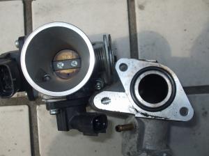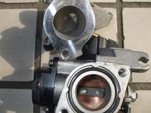 電子制御燃料噴射装置です。50CCや125CCには少し無理がある装置に感じていますが。特にV125はカーボンが溜まり易く症状も出やすい車両です。今回の車両は7000キロぐらいでしたがカーボンが溜まっていました。症状としてはエンジンのかかりが悪くなった。かかっても安定していない。吹け上がりが悪い。レスポンスが悪い(アクセルとエンジンの吹け上がりが遅れる)。最悪は急停止や信号待ちなどでエンジンが止まるなどです。右側がインジェクションのコントロール部分でエァークリーナー側から見ています。左側はマニホールドです。
